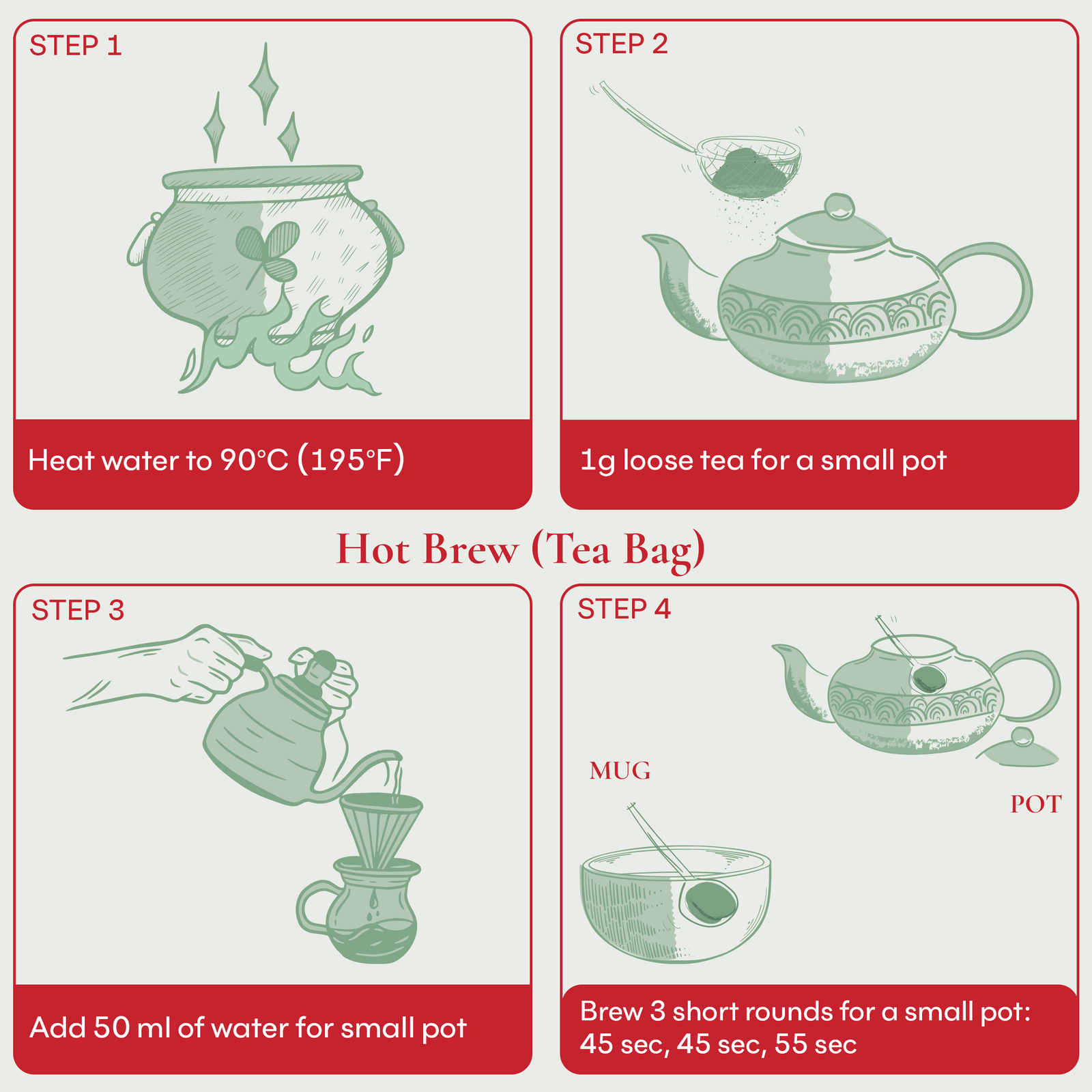 Steep 45 seconds for the first round, 45 seconds for the second, and 55 seconds for the third. Each round reveals a new layer - fresh floral first, then softer sweetness, then a longer, smoother finish.